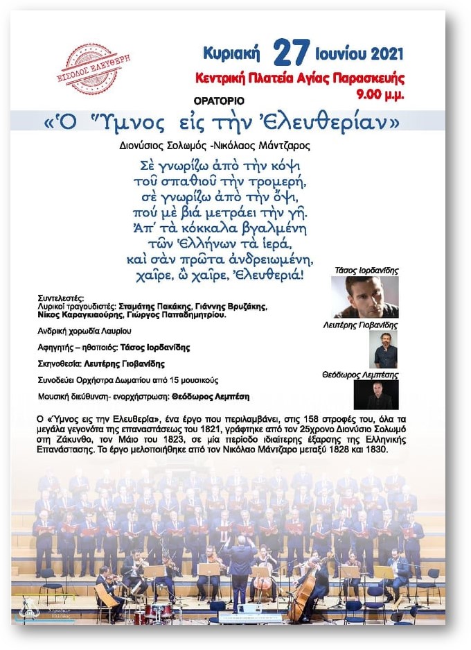Όλα τα σημαντικά γεγονότα της Ελληνικής Επανάστασης συμπυκνώνονται στους 158 στίχους του έργου «Ύμνος εις την Ελευθερίαν» που έγραψε ο εθνικός μας ποιητής, Διονύσιος Σολωμός το 1823 και τους οποίους μελοποίησε μοναδικά ο Νικόλαος Μάντζαρος.